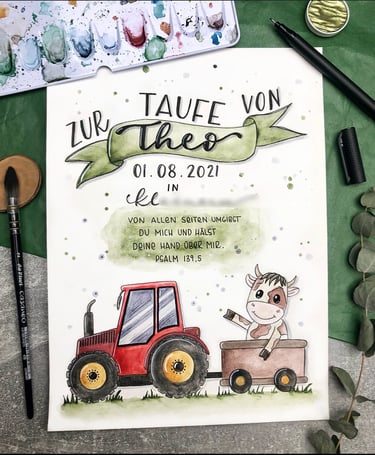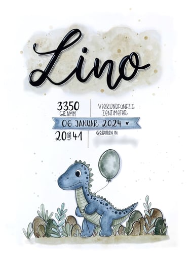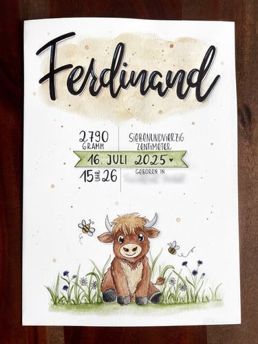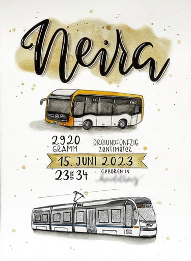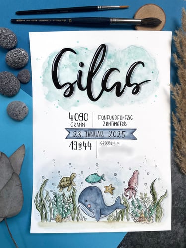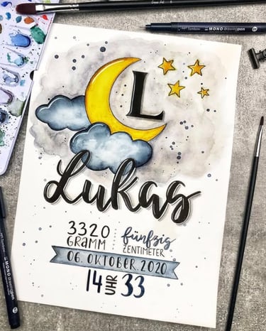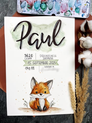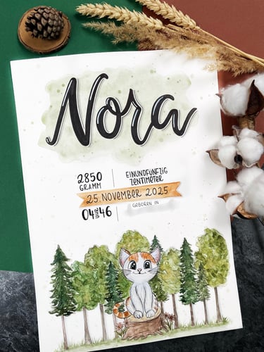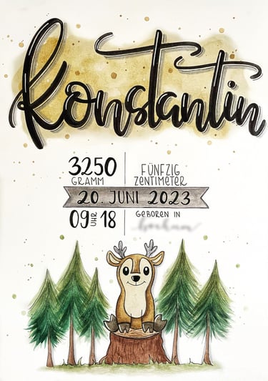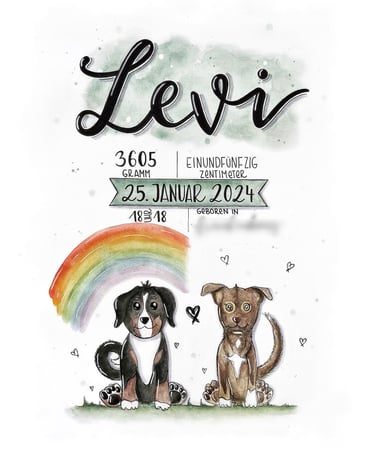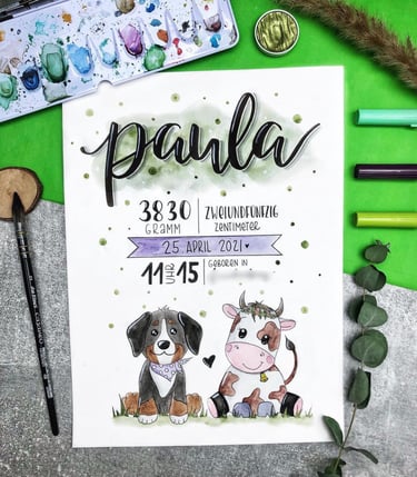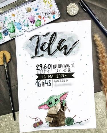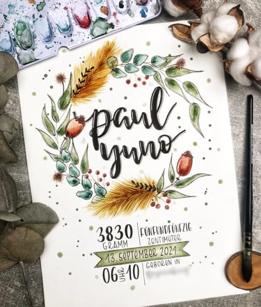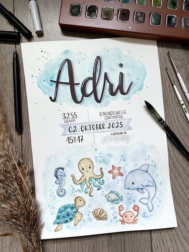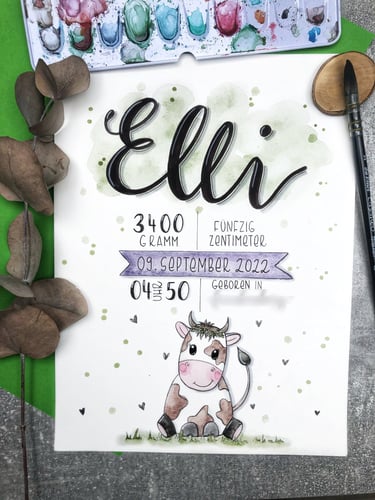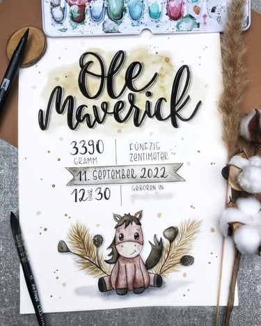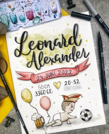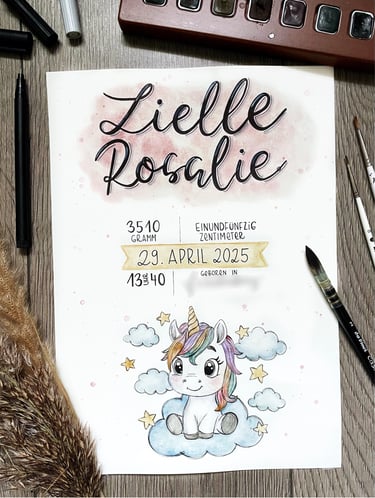 Jedes Bild ist einzigartig und wird nach deinen Wünschen gestaltet. Es enthält alle wichtigen Daten des Neugeborenen, sowie eine (persönliche) Zeichnung mit Aquarellfarben.